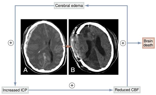This situation can ultimately progress to brain death if ICP becomes so high that the cerebrum is not perfused.