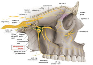 - Vidian nerve enters posterior margin of sphenopalatine ganglion in pterygopalatine fossa via vidian canal.