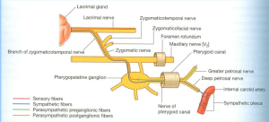 - Vidian nerve: union of greater petrosal nerve (parasympathetic fibers from facial nerve @ geniculate ganglion level) & deep petrosal nerve (sympathetic fibers from carotid plexus) → lacrimal gland & nasal mucosa.