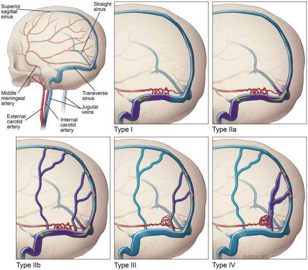 - Type IIa (Sinus) - DAVF drains into venous sinus with reflux