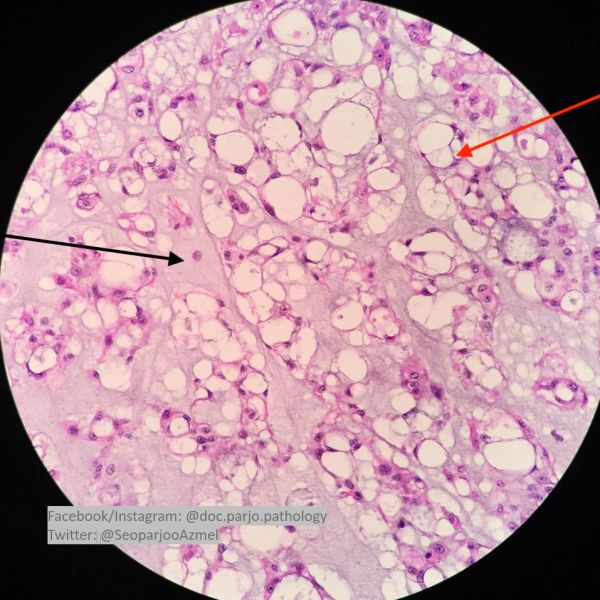 Extracellular myxoid matrix (black arrow), Physaliphorous cell - bundant, vacuolated/bubbly cytoplasm (red arrow)