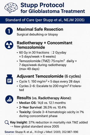 | Median overall survival (surgery + XRT + chemo) | 15 months | 31 months |